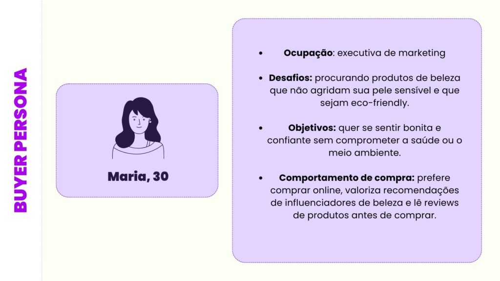 Vamos supor que sua empresa venda produtos de beleza naturais. A representação da sua buyer persona, ou seja, do seu cliente ideal, poderia ser: