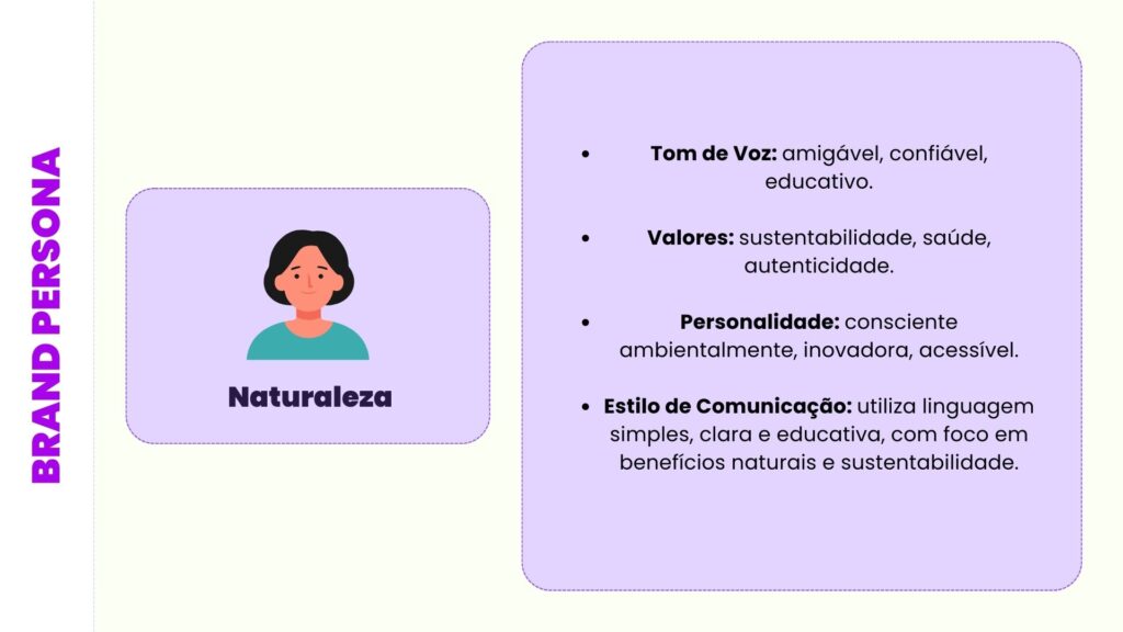 Agora, se sua marca de produtos de beleza naturais tivesse uma personalidade, sua brand persona poderia ser algo como: