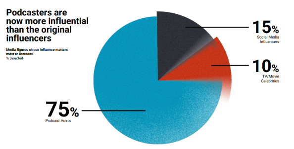 O estudo A New Era of Influence realizado pela Vox Media e pela MAGNA apontou que 75% dos ouvintes valorizam mais a influência dos podcasters do que a de influenciadores de mídia social (15%) e celebridades de TV/cinema (10%). Esses dados trazem novos cenários para as marcas, que agora encontram diferentes caminhos para escolher quem pode se comunicar melhor com seu público.